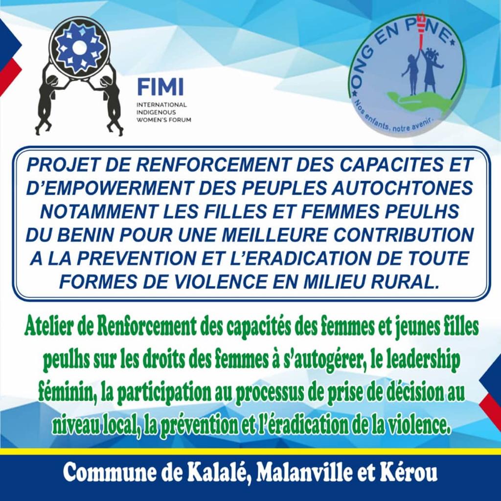 S’inscrivant dans sa mission de promotion des droits des femmes autochtones notamment les peules au Bénin et particulièrement leur autonomisation, l’ONG EN PINE avec l’appui Technique et Financier du Comité de Coordination des Peuples Autochtones d’Afrique (IPACC) met en œuvre le projet « Renforcement des capacités des femmes autochtones en Afrique francophone ». A travers ce projet, l’organisation entend renforcer les capacités des femmes autochtones afin qu’elles puissent participer quantitativement et qualitativement aux instances de prise de décision en ayant les compétences, les capacités et les ressources nécessaires pour gérer leurs propres organisations et projets pouvant améliorer ainsi leur statut social, économique et politique dans leurs pays. Ainsi, quatre communes du Nord Bénin sont retenues dans le cadre de la mise en œuvre de ce projet à savoir : Kalalé, Kérou, Péhunco et Malanville. L’objectif étant d’organiser des activités de renforcement de capacités et d’appui matériels au profit des groupements de femmes ces communes.